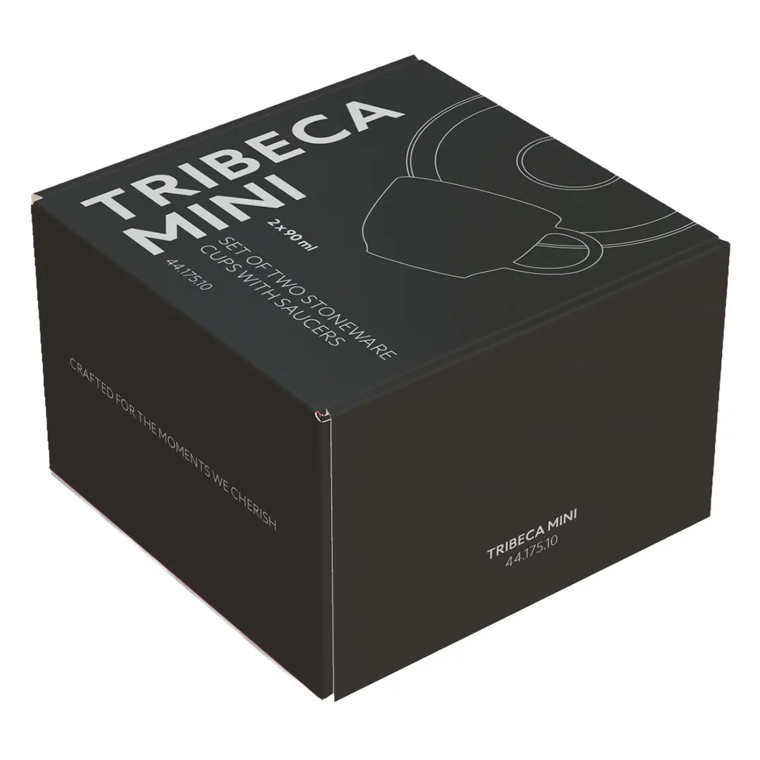 TRIBECA MINI je set od dve manje keramičke šoljice sa tacnama, svaka kapaciteta 90 ml, namenjen ljubiteljima kraćih kafa poput espressa i ristreta. Poseduje sve karakteristike Tribeca kolekcije - inovativnu završnu glazuru spolja i iznutra, koja daje jedinstven teksturni efekat i prijatan osećaj pri držanju, vizualno ističući i naglašavajući štampu laserskom gravurom. Moderan dizajn i taktilna završna obrada čine ovaj set atraktivnim promotivnim proizvodom i poslovnim poklonom. TRIBECA MINI dolazi upakovan u premium crnu poklon kutiju, što ga čini spremnim za efektno predstavljanje i brendiranje na događajima, kampanjama ili kao deo premium poklon paketa.