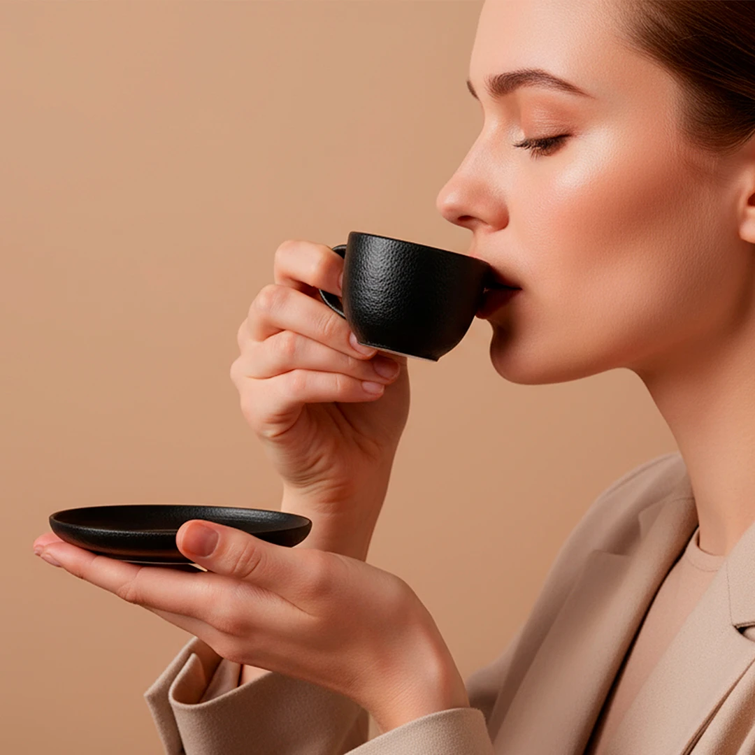 Materijal: keramika • Set: 2 šoljice + 2 tacne • Kapacitet: 2 × 90 ml • Glazura spolja i iznutra (efekat teksture) • Pogodno za pranje u mašini za sudove • Pogodno za upotrebu u mikrotalasnoj pećnici • Premium poklon pakovanje