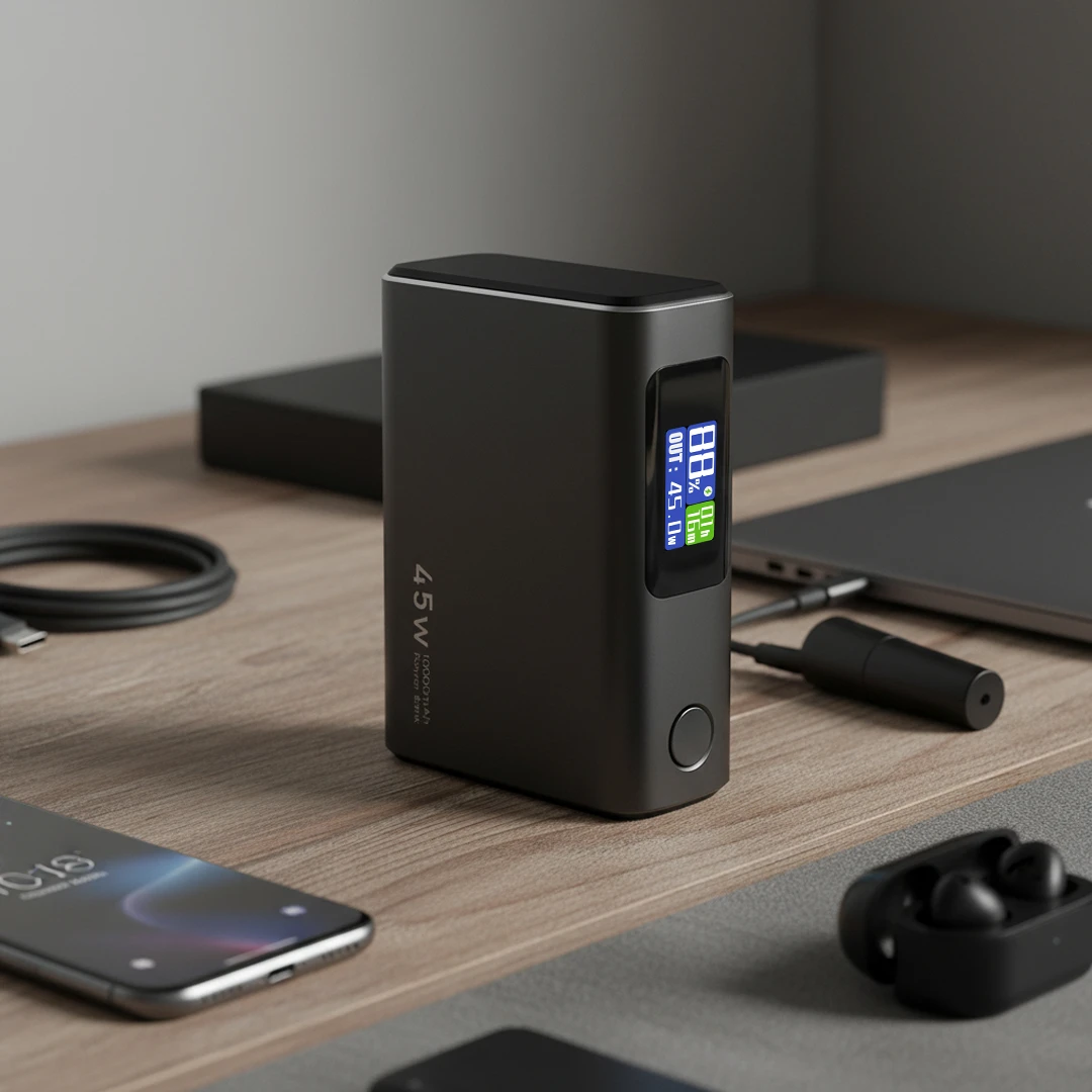 Kapacitet baterije: 10.000 mAh • Type-C ulaz: 5V/3A, 9V/3A, 12V/2.25A, 15V/2A, 20V/1.5A (30W max) • Type-C izlaz: 5V/3A, 9V/3A, 12V/3A, 15V/3A, 20V/2.25A (45W max) • USB-A izlaz: 5V/3A, 9V/3A, 12V/1.5A (18W max) • Ukupan izlaz: 5V/3A (15W max) • Aluminijumsko kućište • Kolorni displej sa prikazom snage punjenja